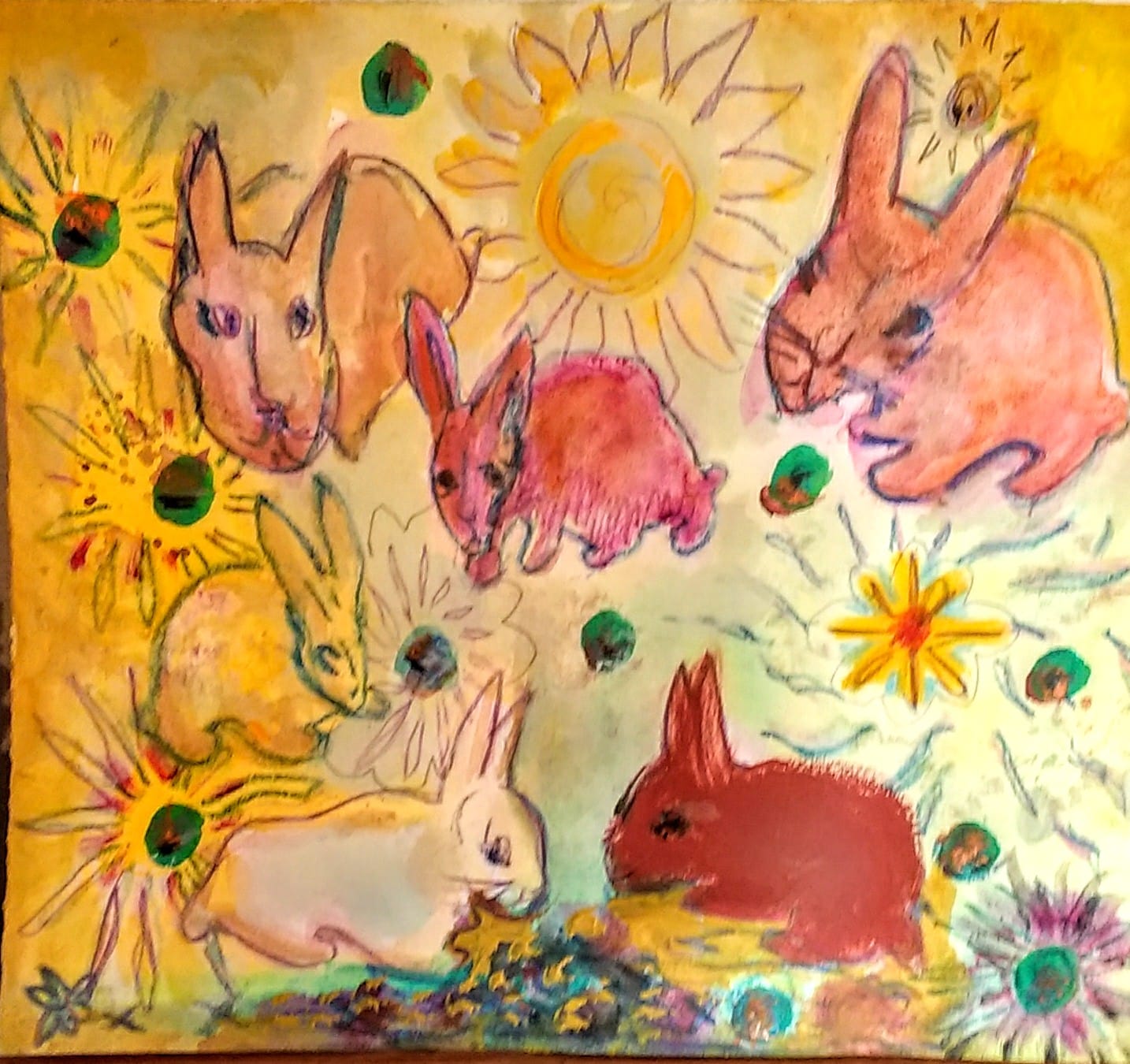 Bunnies, “Bunny Hop”, 10″H x 11.25″ W, Acrylic on Stonehenge paper