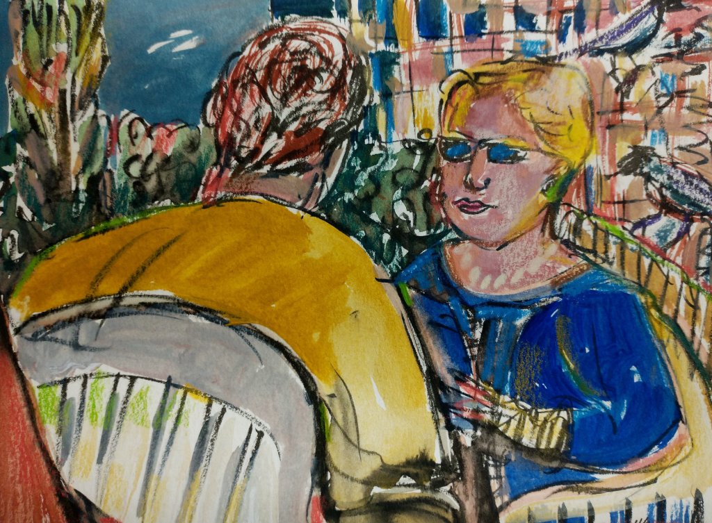 “Cafe Life” 1990 series of drawings and paintings“The Good Life”, 30 x 44″, acrylic paint on Stonehenge paper, 2008“Geraniums”, 16 x 12 ready to hang canvas