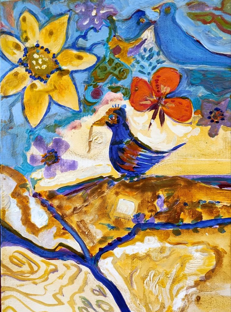 Birdies, “Blue Bird’s Feast”, 30″ H x 22″ W Acrylic on Stonehenge paper