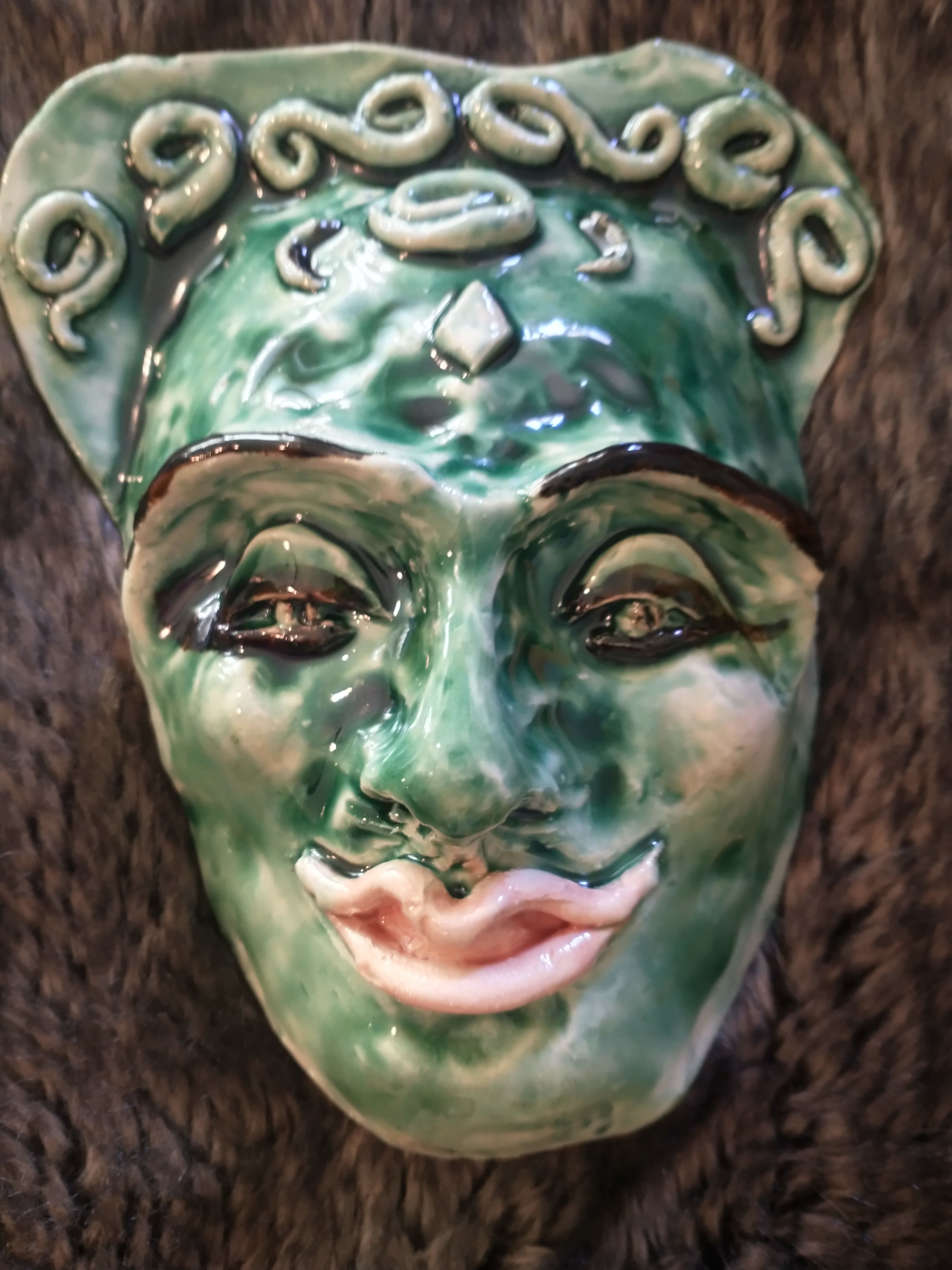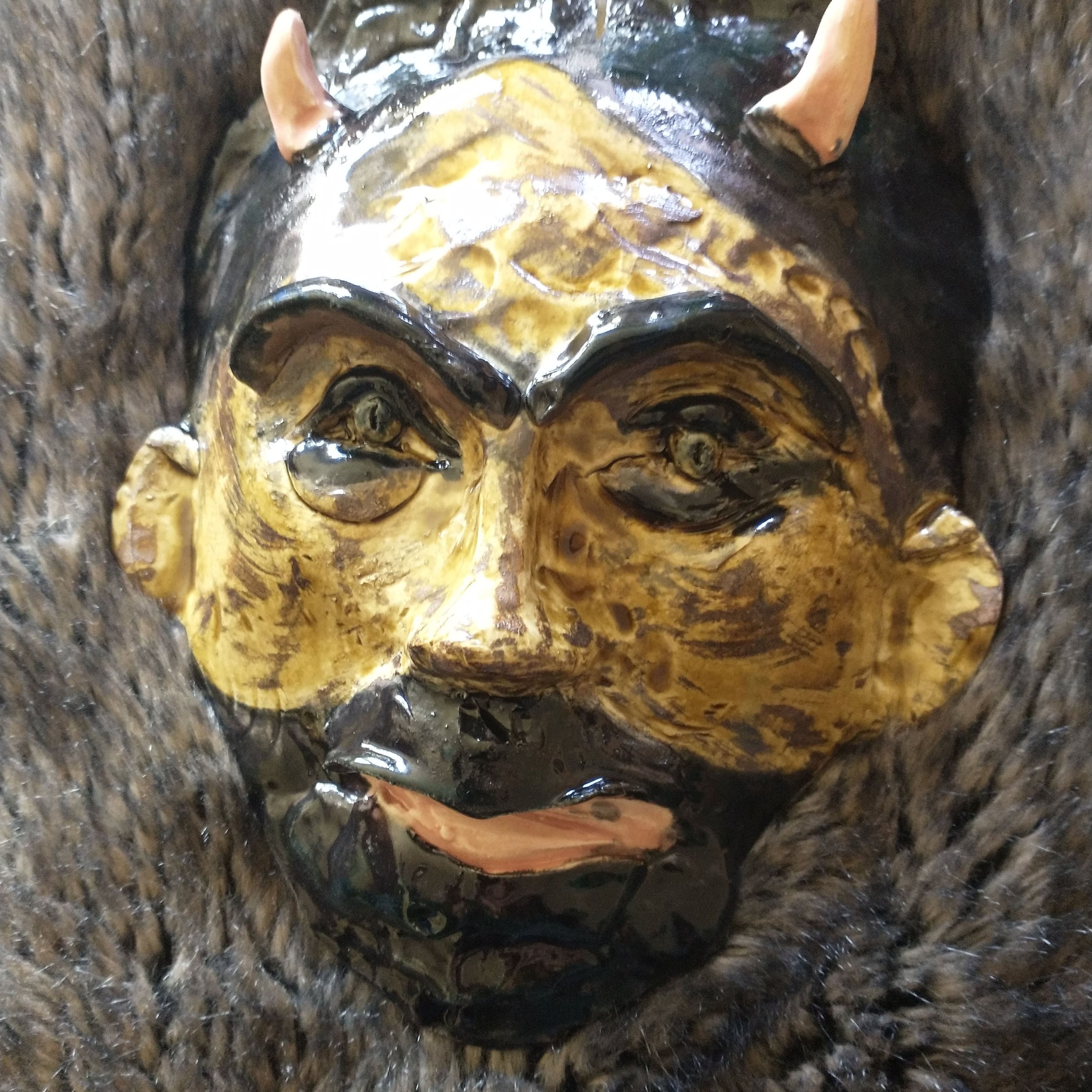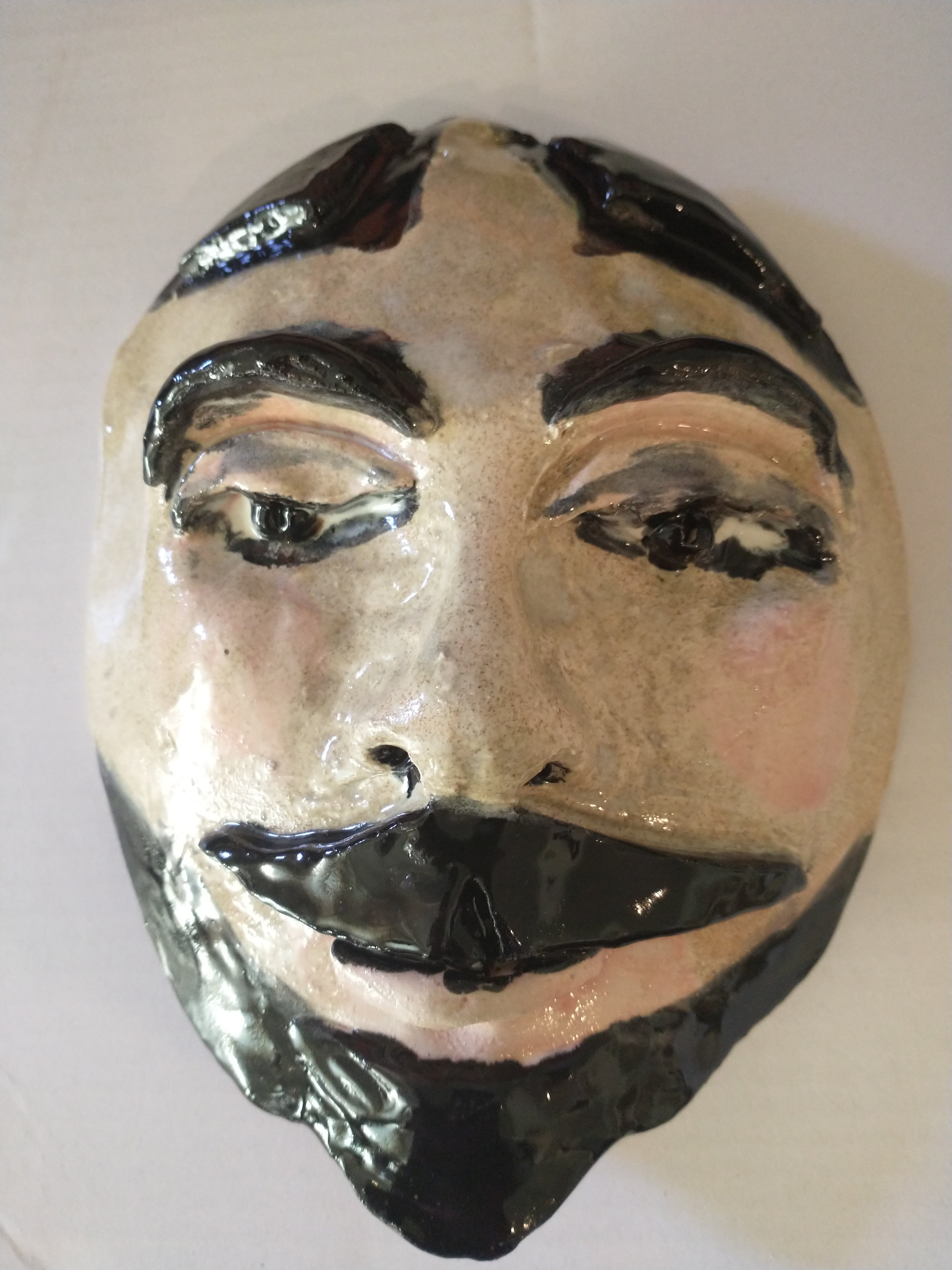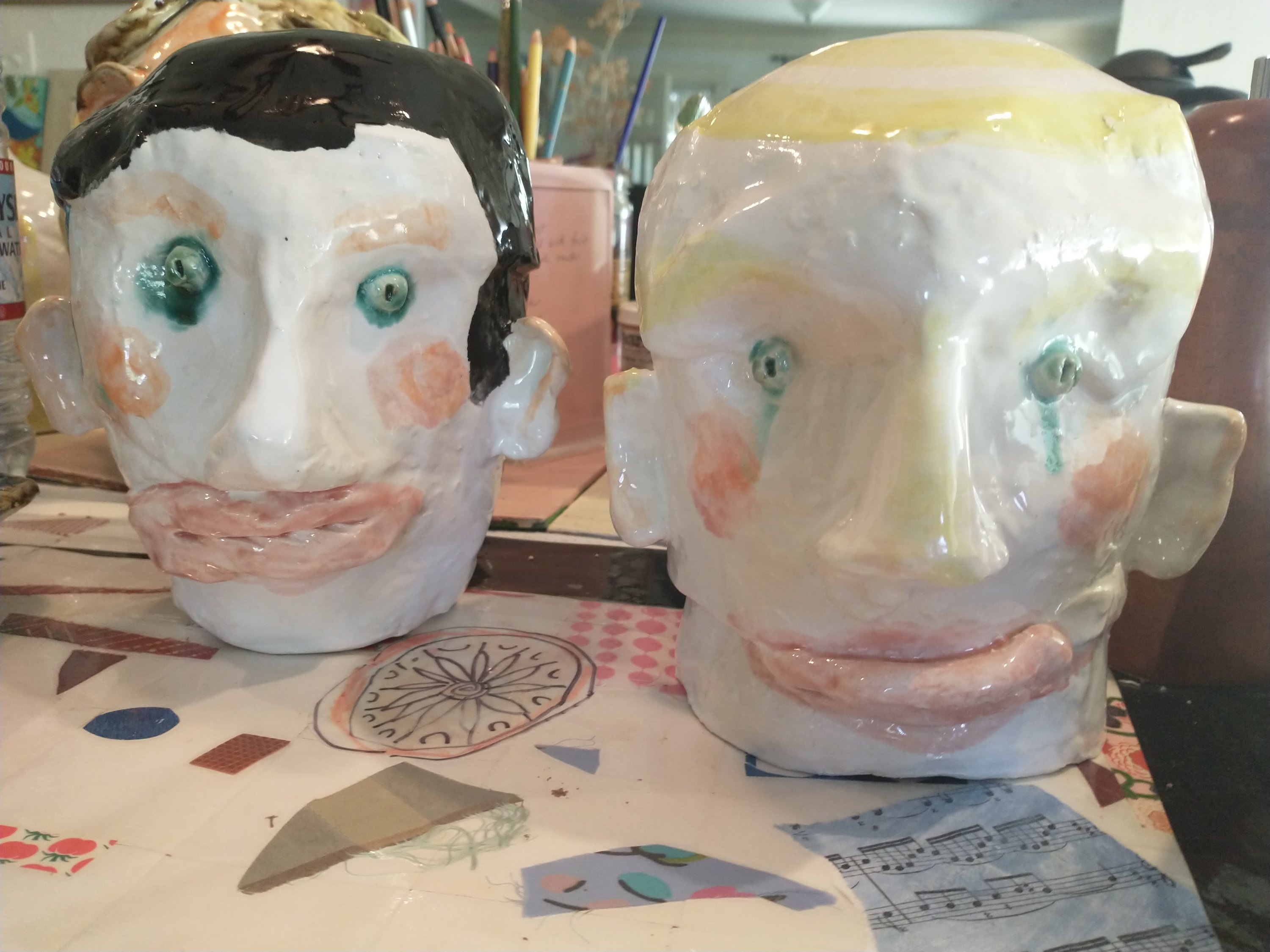 A few weeks before Halloween, I created a group of 14 masks and busts in cone 5 clay. Some were based on faces that I had seen, including my own and various neighbors and some were fanciful fictional, much like my puppets and paintings.