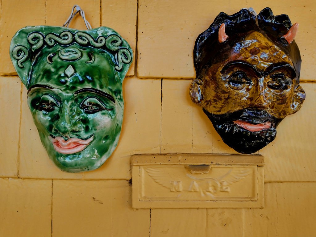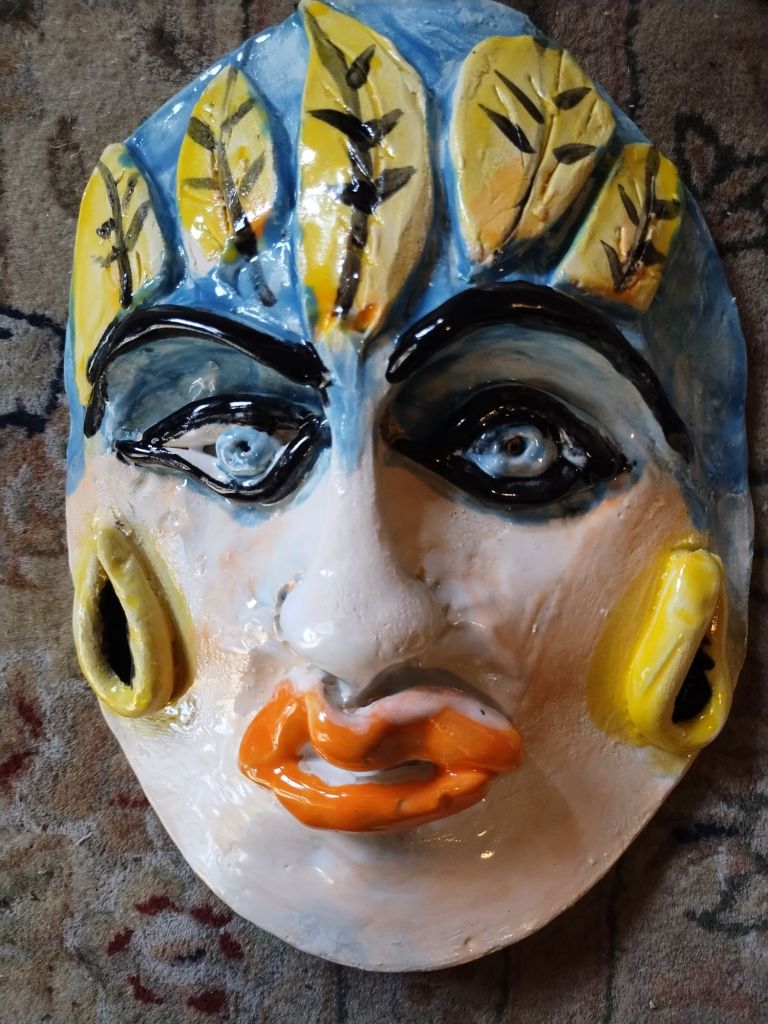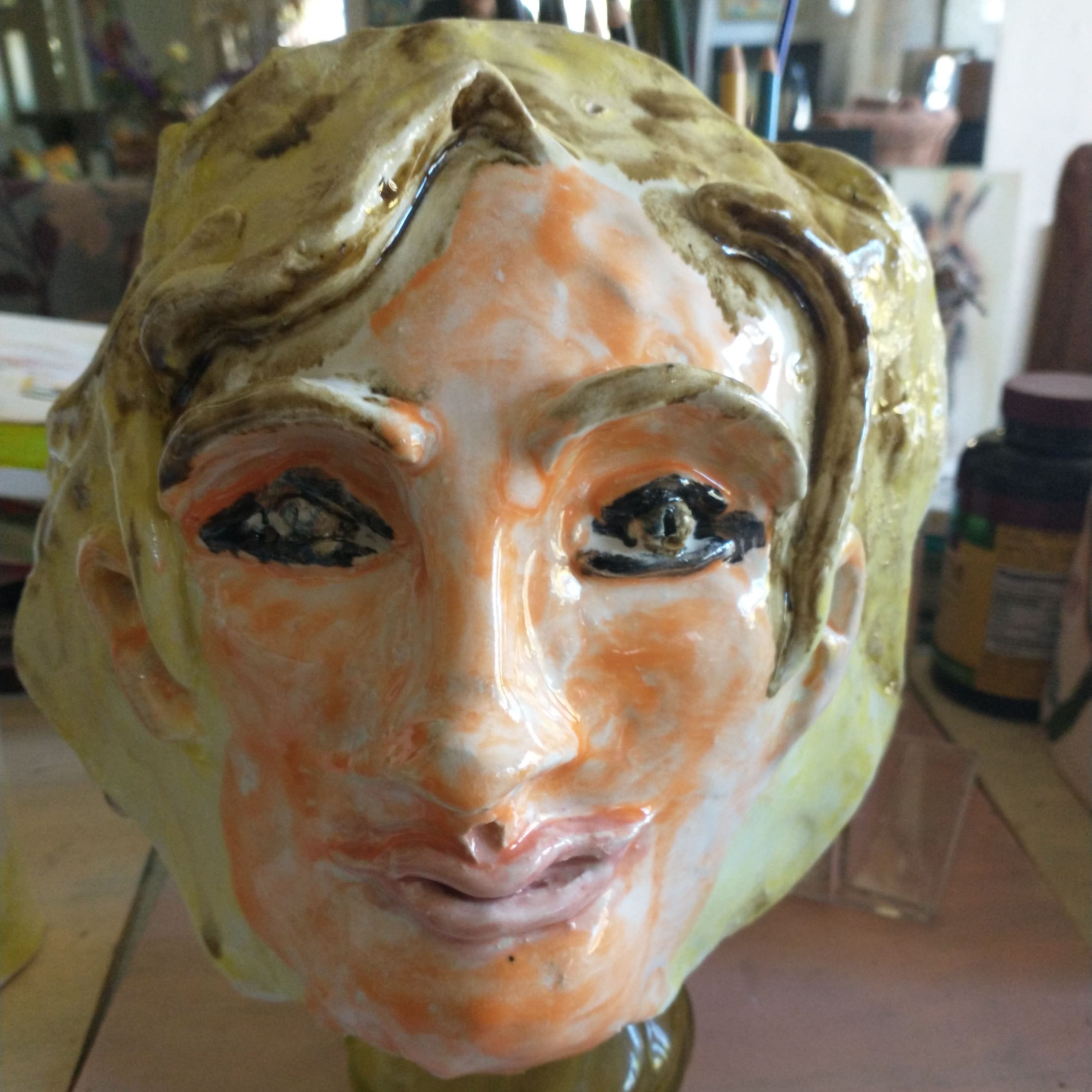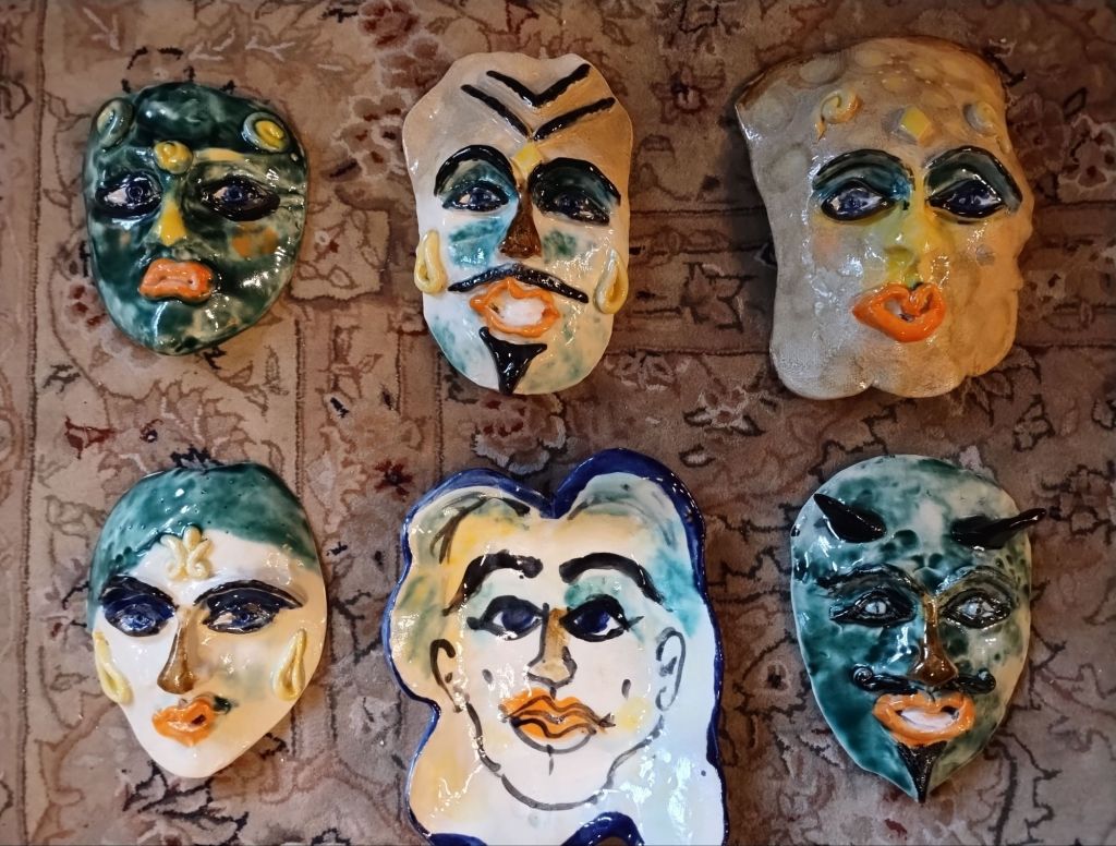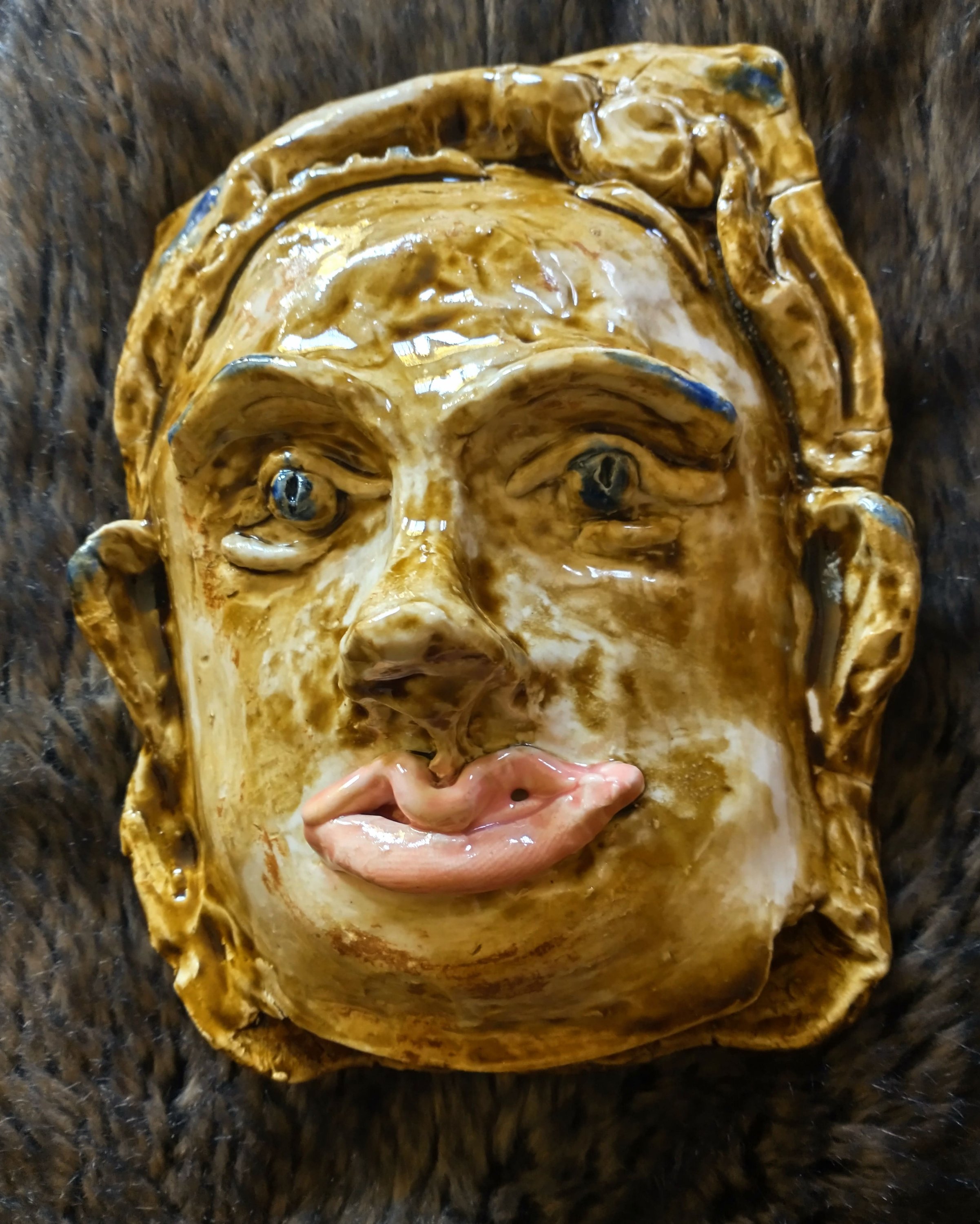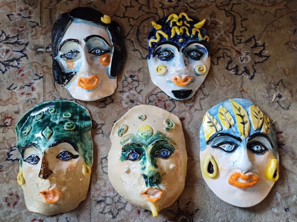 A few weeks before Halloween, I created a group of 14 masks and busts in cone 5 clay. Some were based on faces that I had seen, including my own and various neighbors and some were fanciful fictional, much like my puppets and paintings.