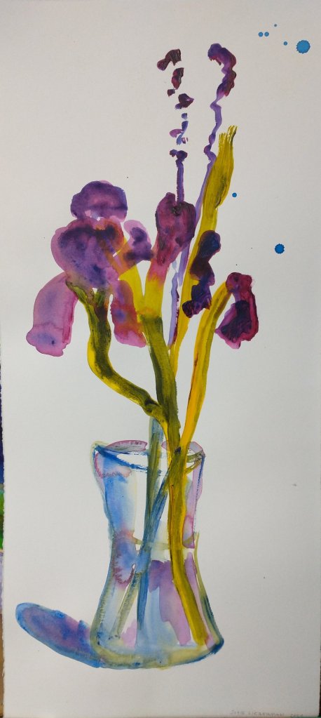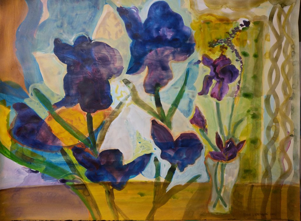 Garden of Irises, 22 x 30″, acrylic paint on paper by Joyce Lieberman“Iris in a Vase #2″, 22 x 10”, acrylic paint on paper by Joyce Lieberman“Iris in a Vase #1″, 22 x 10”, acrylic paint on paper by Joyce Lieberman“IRIS”, 30 x 22″, acrylic paint on paper by Joyce LiebermanActual lovely iris in a coke glass.Irises on wood 2024, about 2 x 2′Irises 2024, 30 x 22 ” on Stonehenge Archival Paper