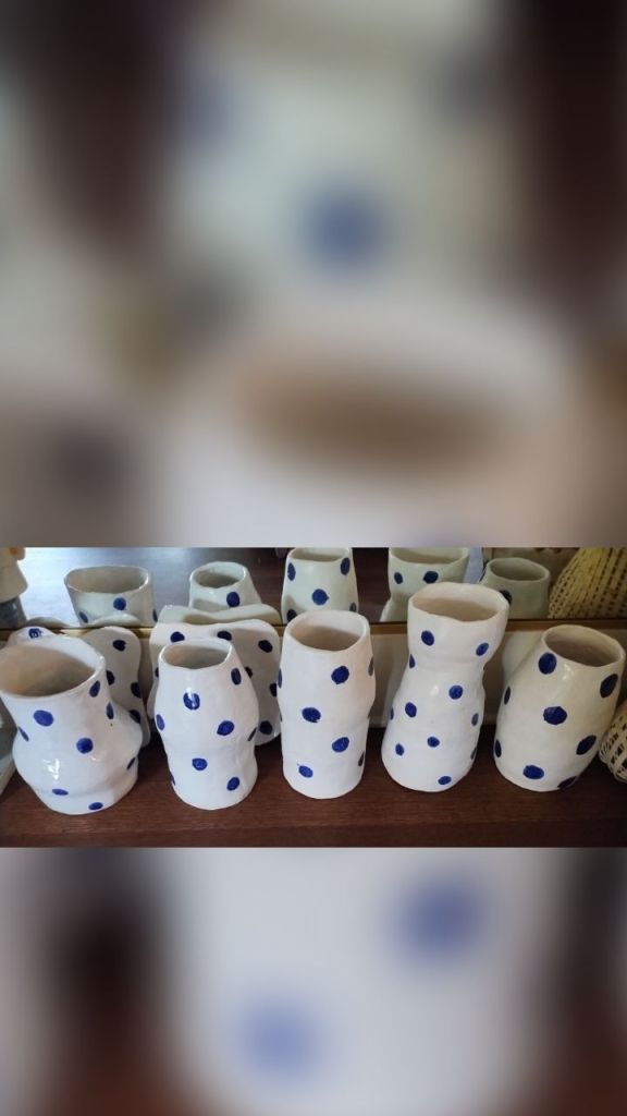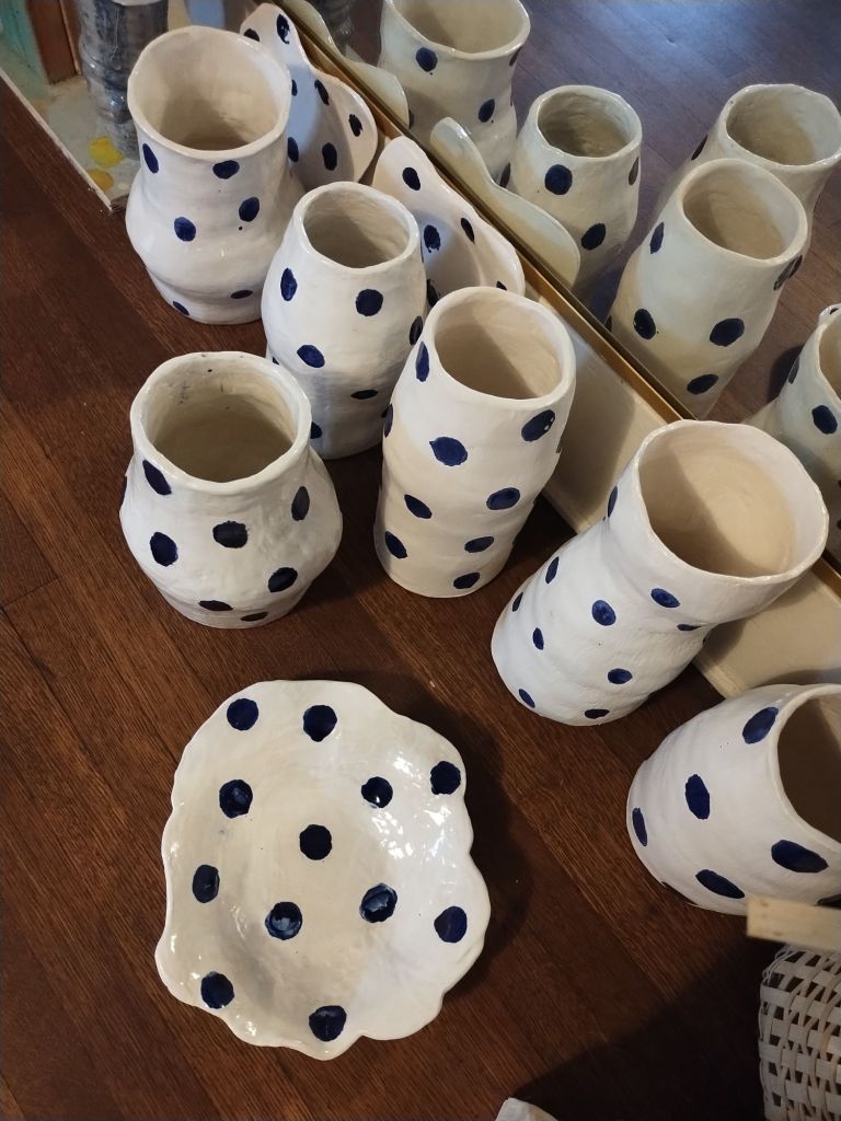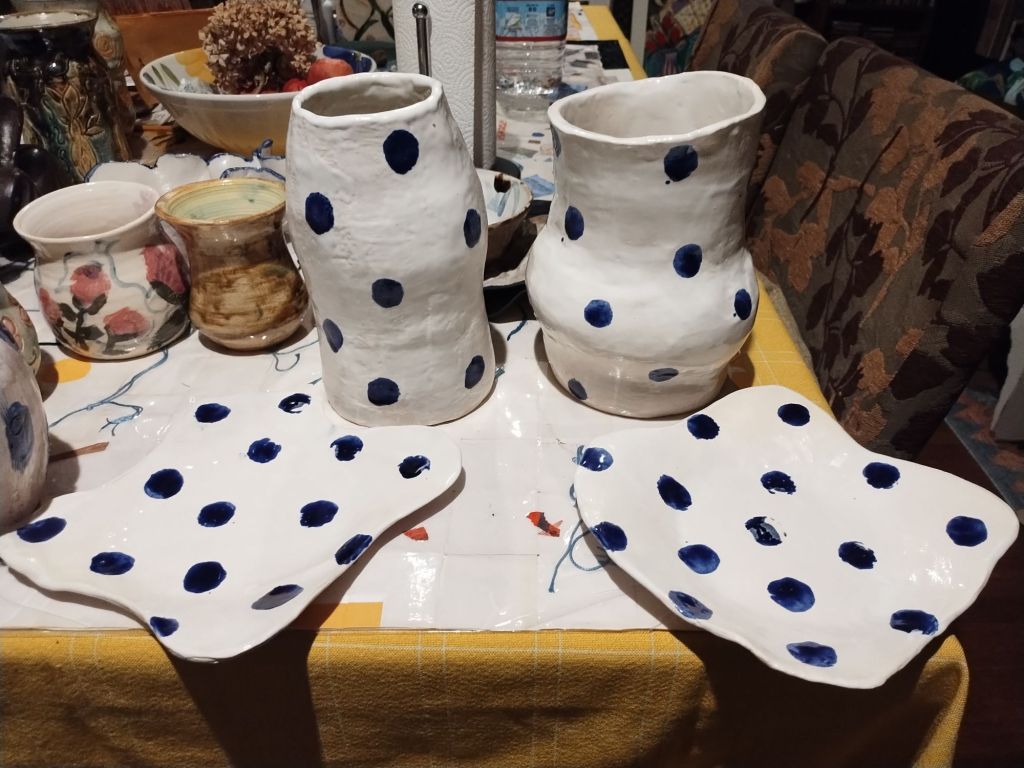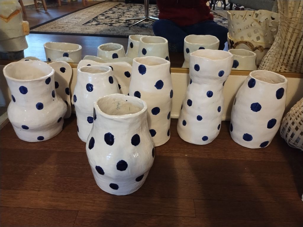 Hand built with coils and slabs, these cobalt blue polka dot vases and platters have a variety of shapes. They make a village in my mirrored space. As a village of polka dots, they shake and shimmy. Working in cone 5 clay, each vase is about 12 inches tall. They could hold a tall bouquet which I grow plenty of. These dotty images are clean and simple.