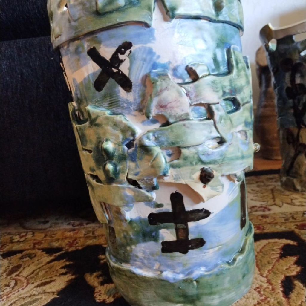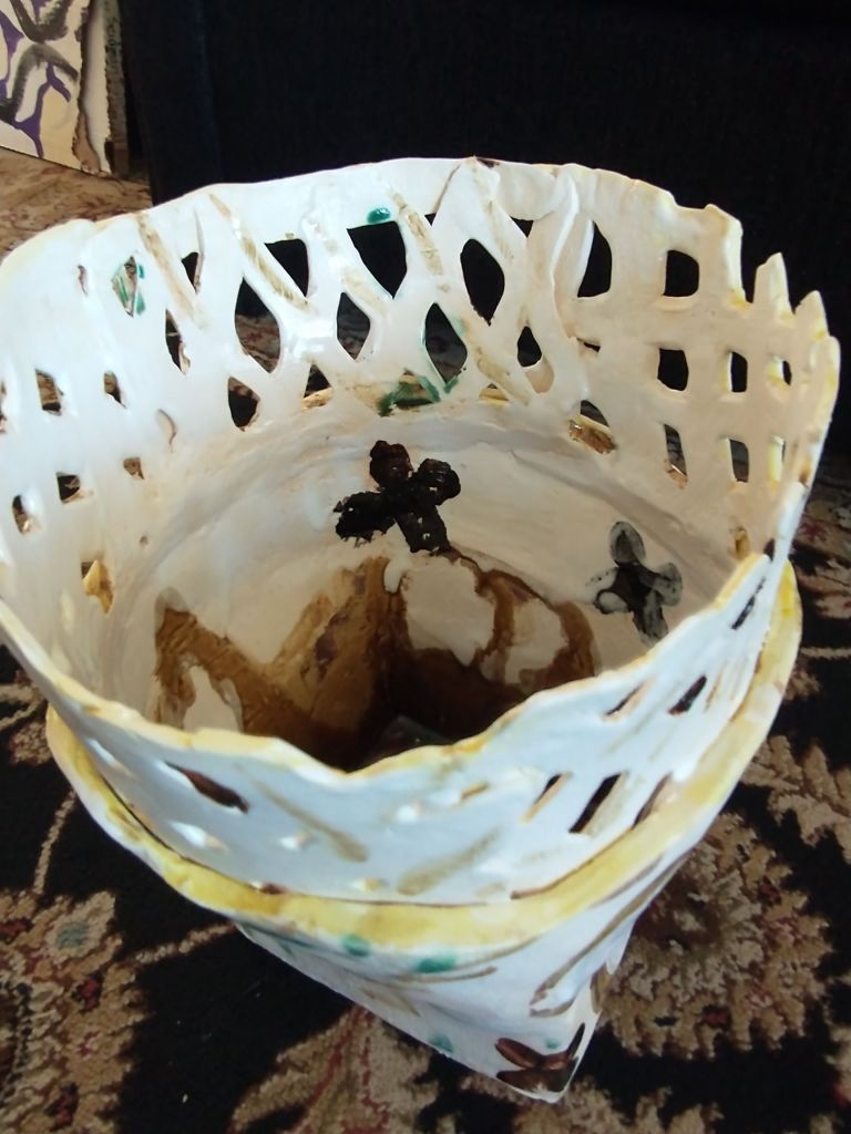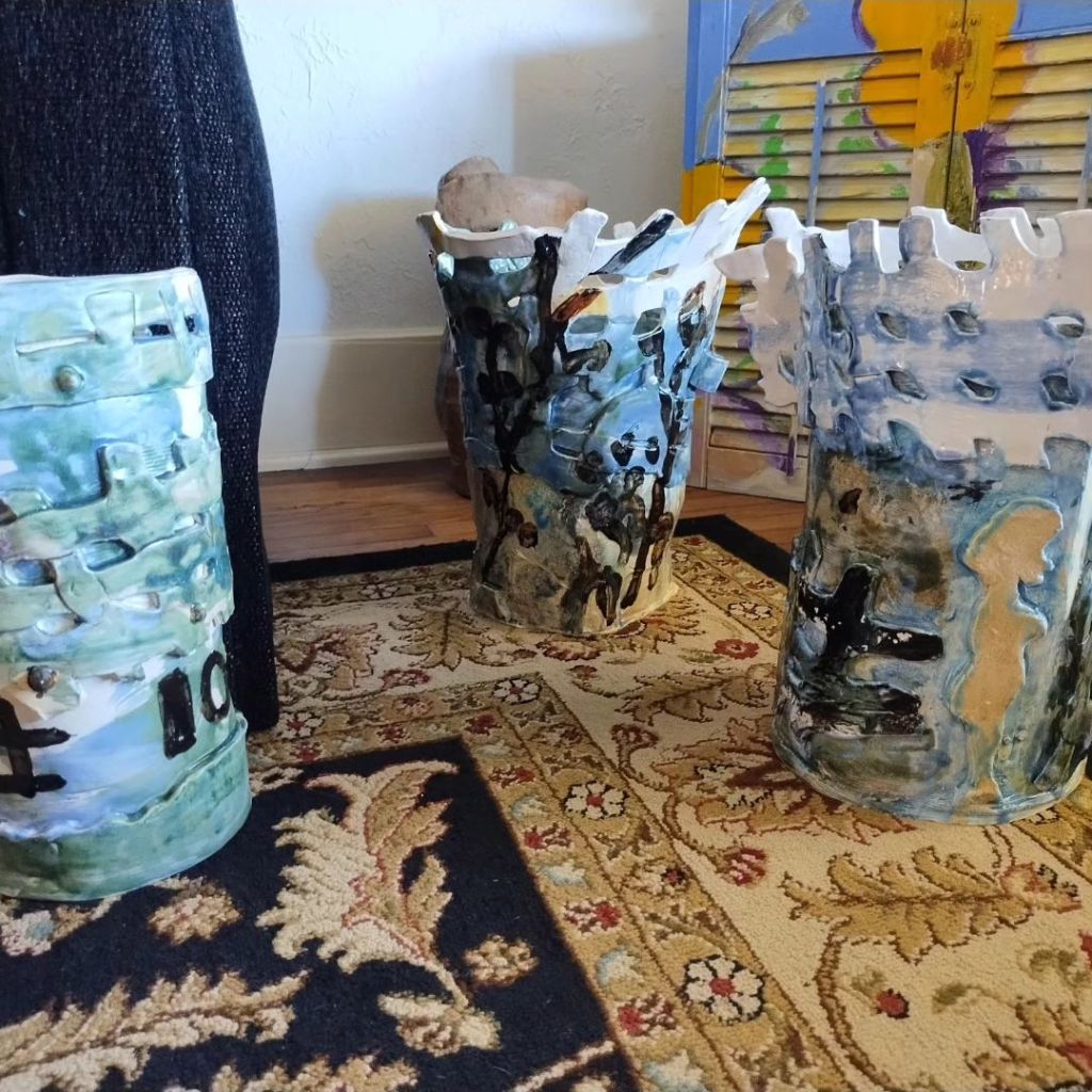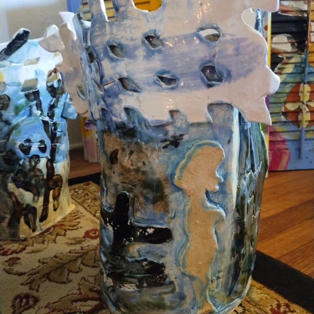 Now that it’s built, I imagine a vinyl wrap for it that looks like dripping glaze. So I thought I would work it out on my recent clay pieces which I adore.