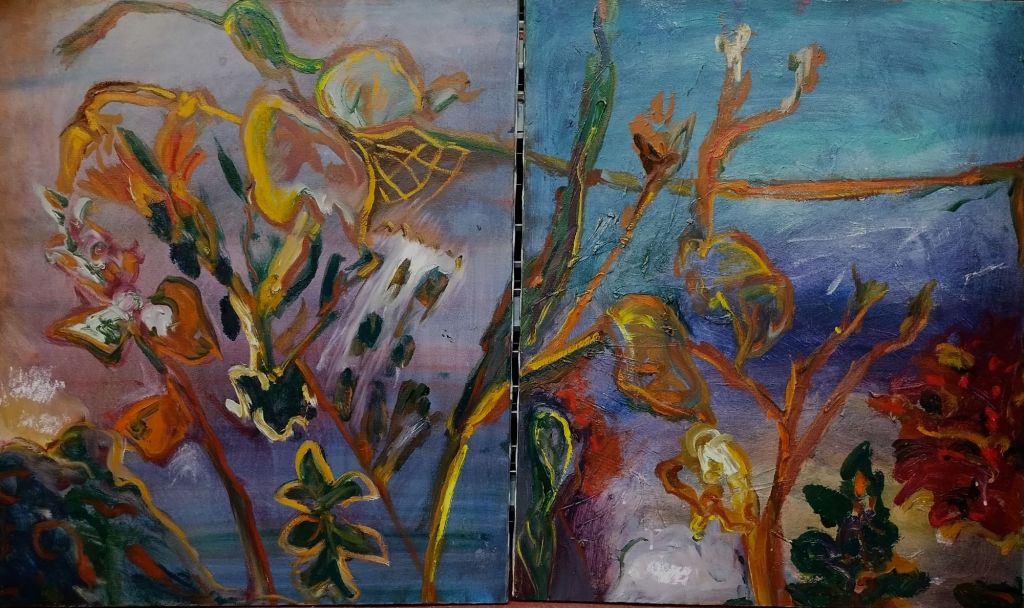 I kept a few oil on canvas projects going and yesterday I pulled out a diptych that needed a touch up.
