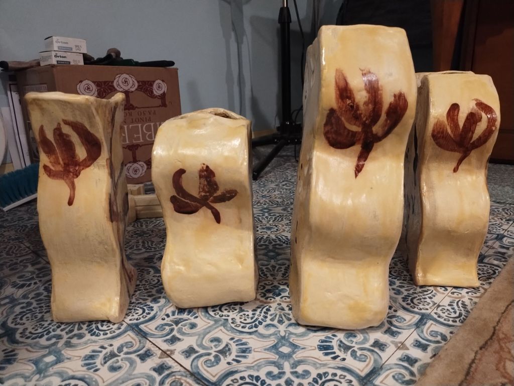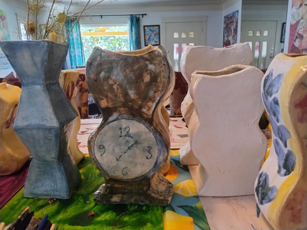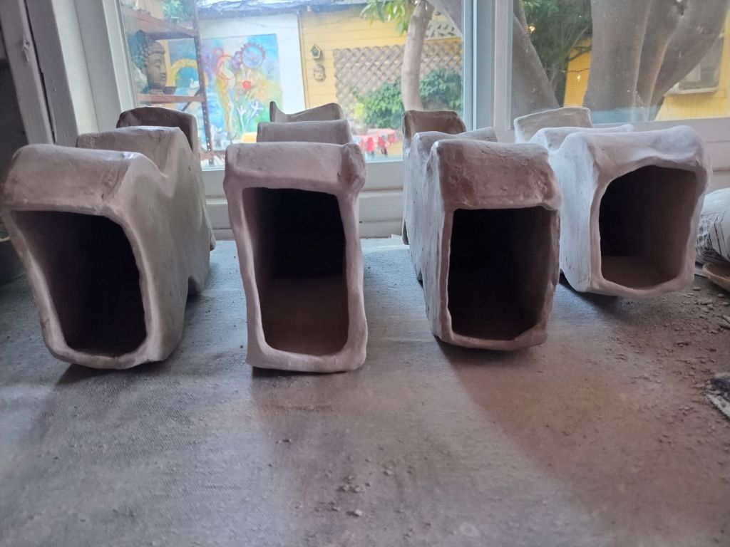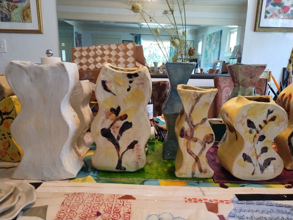 My kiln is small, so the most I could fire at a time were four. The last one has a faux clock. The first group were glazed in a group with each side matching the others in the group. Scroll down to view the pieces as greenware and finished.
