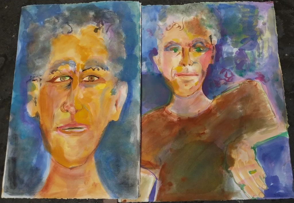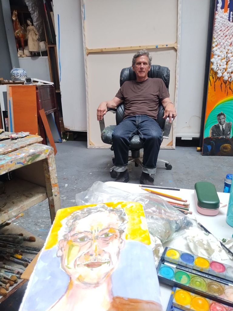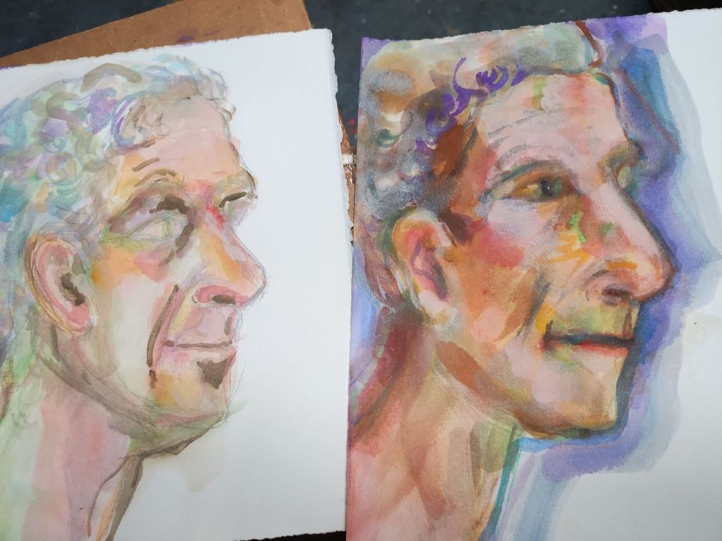 Interesting that the famous artist Les Biller was willing to try a portrait of Jimm in oil paint on canvas. We had six sessions of Jimm modeling for both of us. We were at Les’s studio with his full set up for oil painting and I brought watercolors for portability, like the gear I bring for plein air painting.