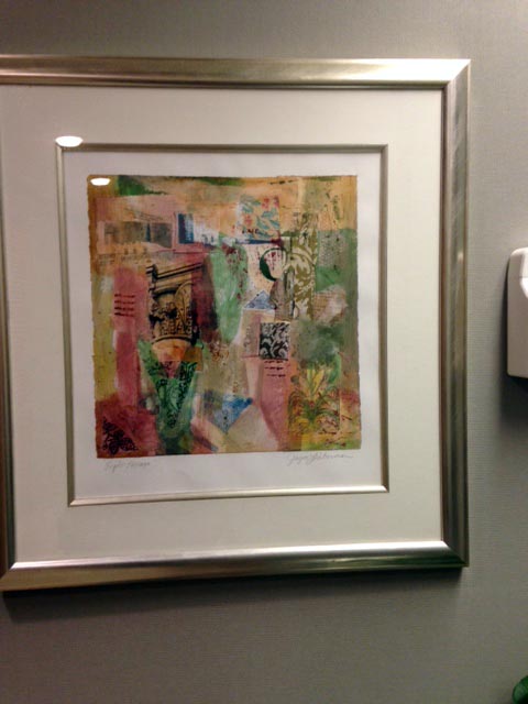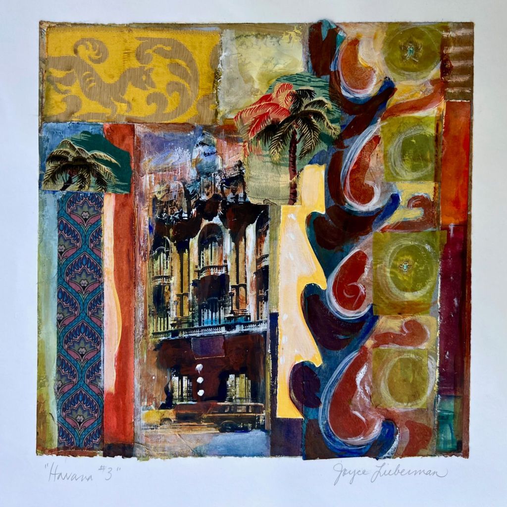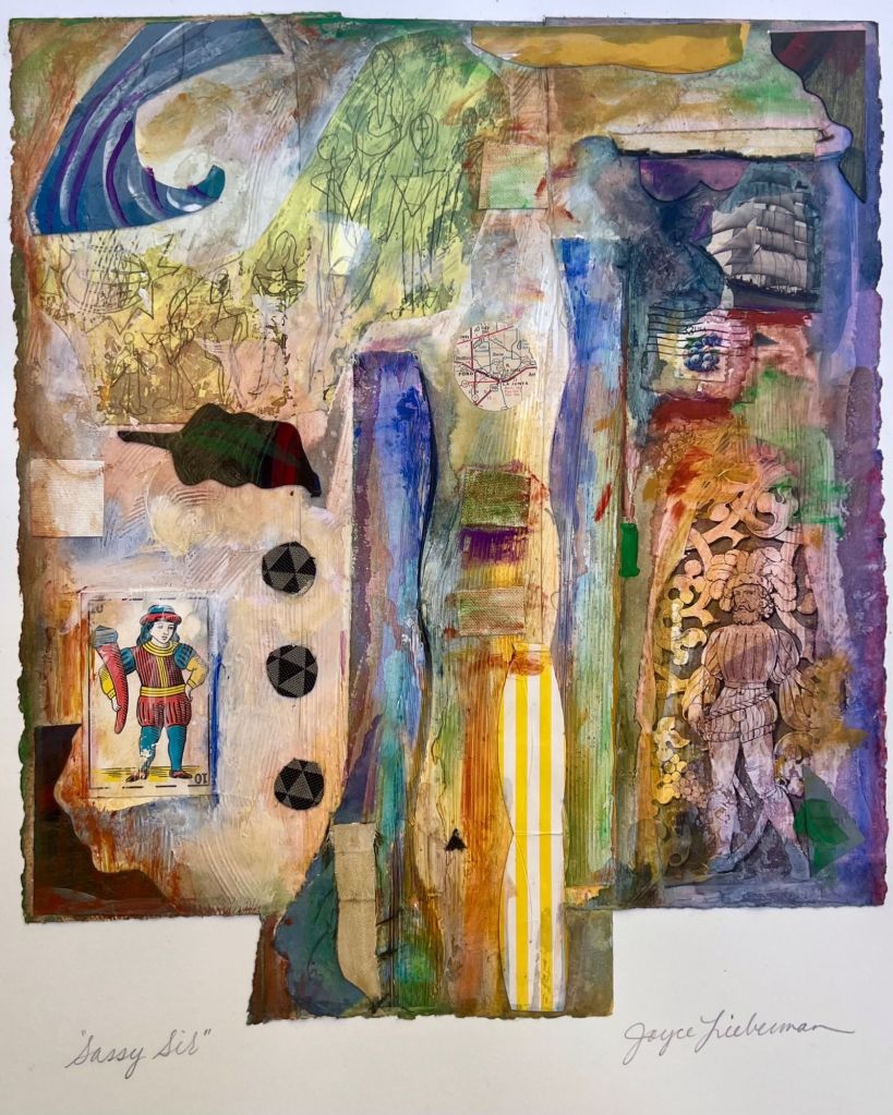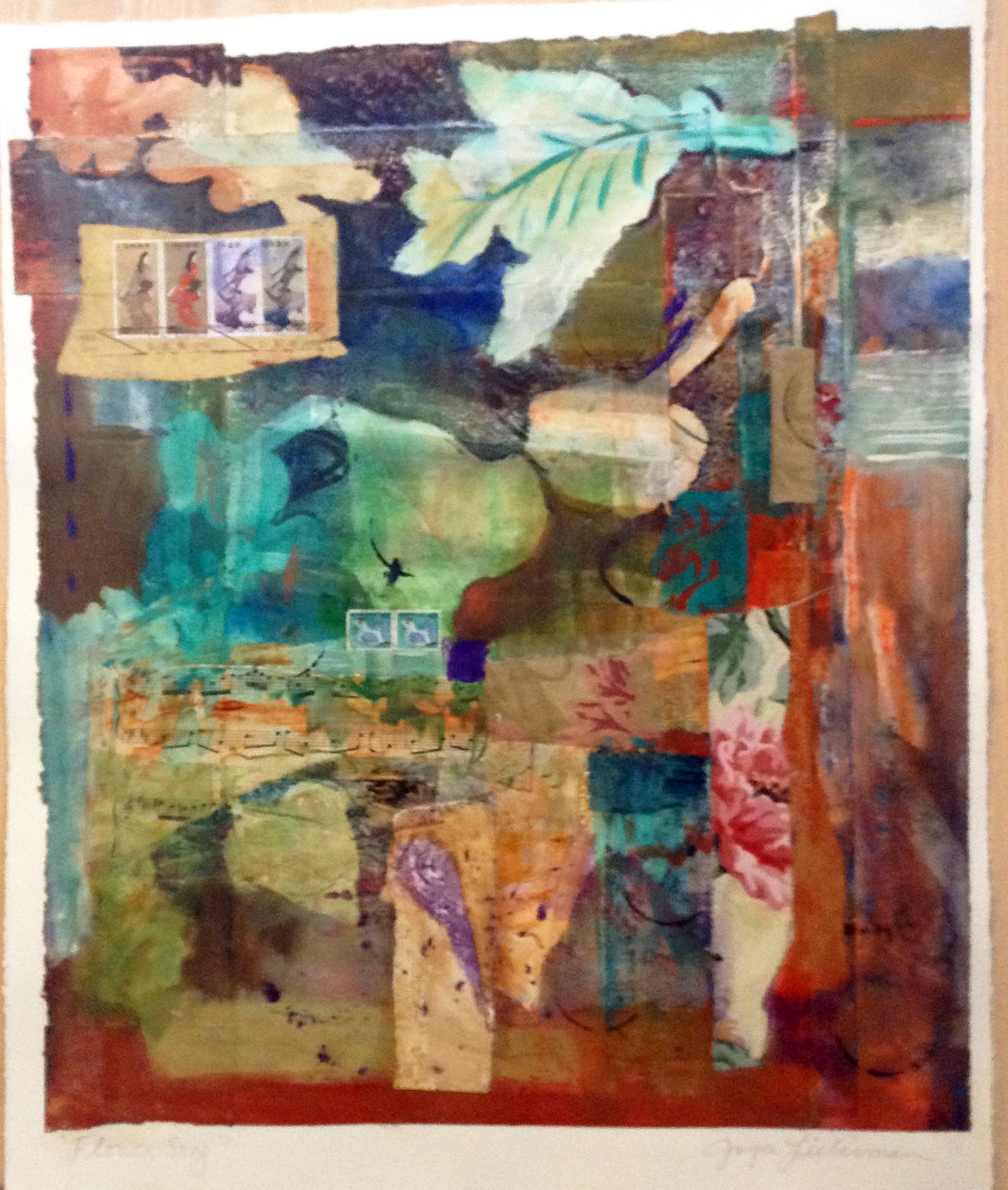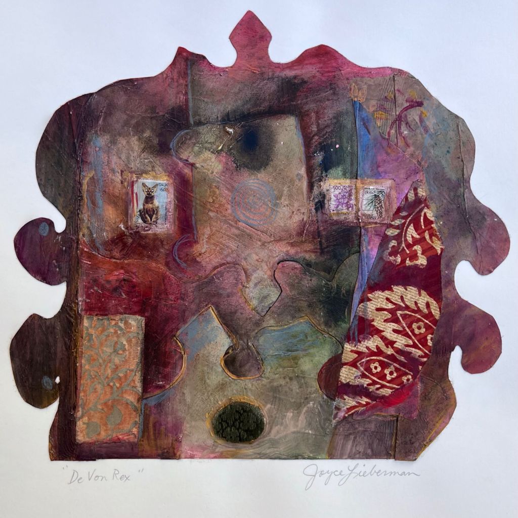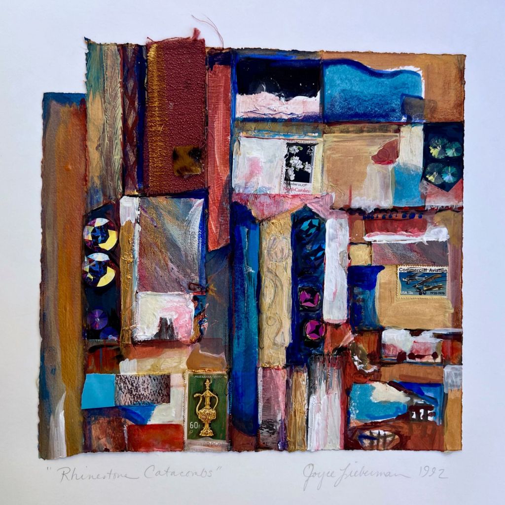 The “Personal Archaeologies” series of collages have been ongoing since 1990. Early versions were in response to great stamps collected from participation in “MAIL ART”, ongoing since graduate school in 1980. Work with interior designers left the studio cluttered with bits of fabrics and scraps of paper that seemed to beg for a creative resolution. Parts of monoprints, older paper paintings that didn’t quite “Work” and general special pieces of paper from travel and various interests made their way into the fabric like woven surfaces of the collages as I cleared a path through the studio desk top. These collages are like a history and intended to be mood pieces.