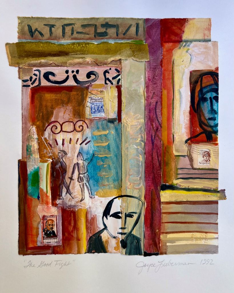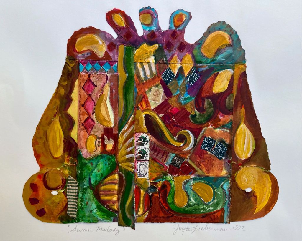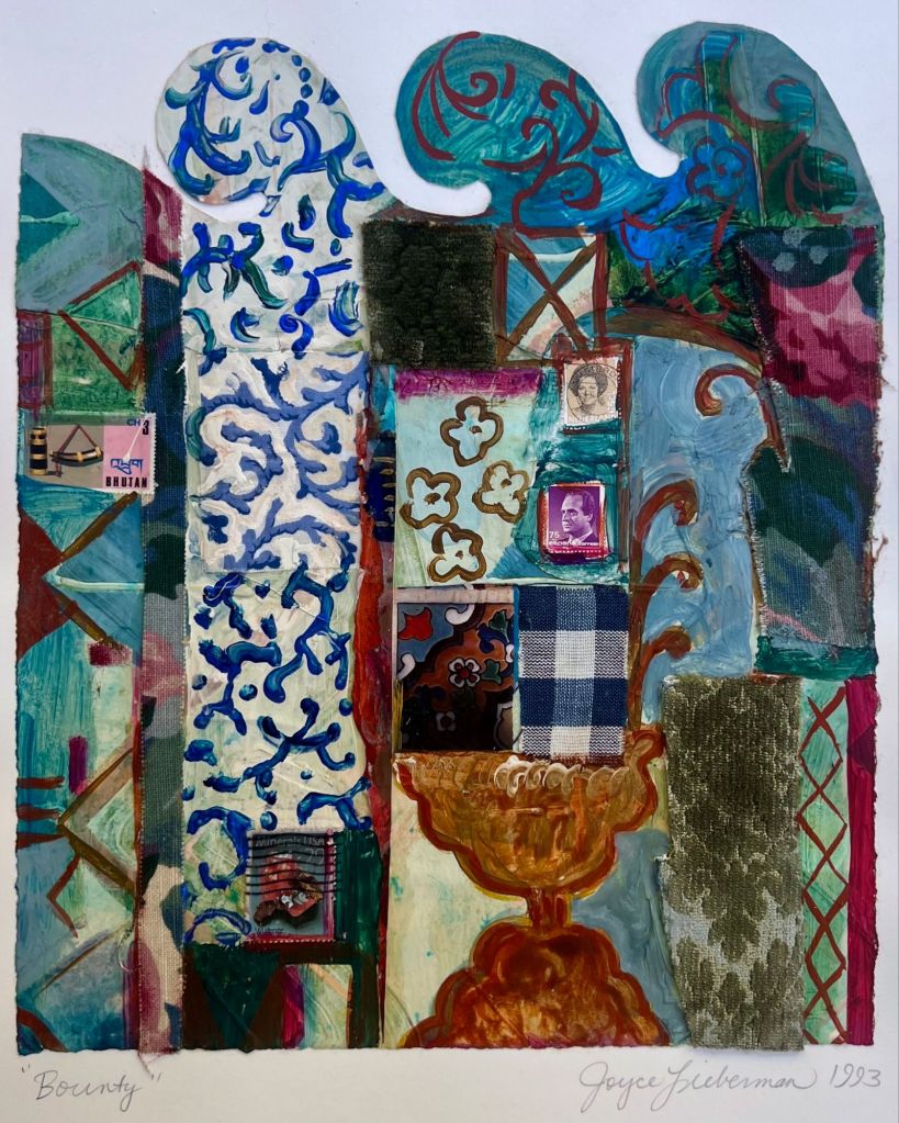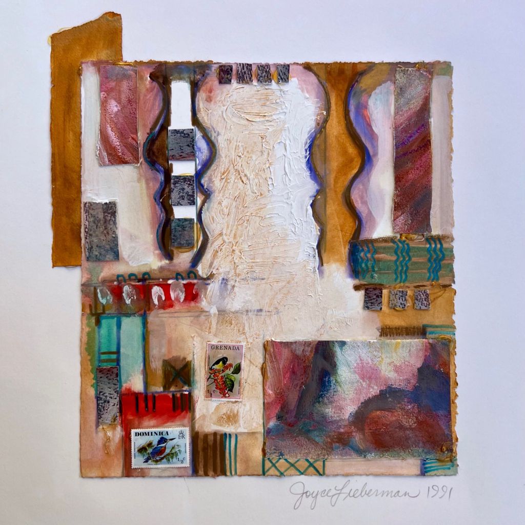 Between 1990 and 2001, Joyce created an expansive body of work she calls Personal Archaeology — more than 1,000 collages that layer fragments of daily life into visual excavations of memory. This presentation offers a focused selection of 14–20 works, each combining postage stamps, fabric, pattern, and drawing into dense, tactile compositions.