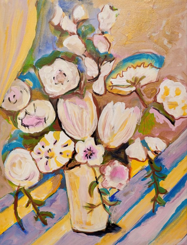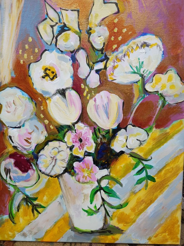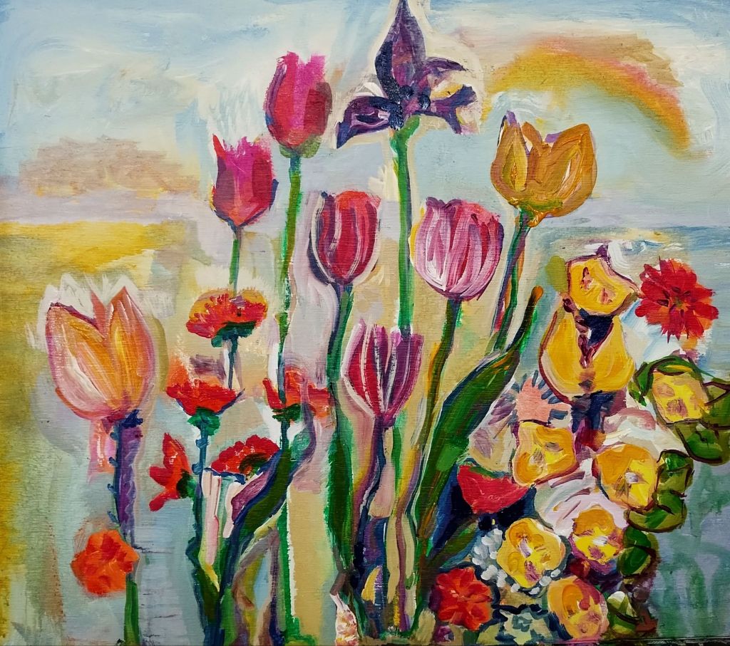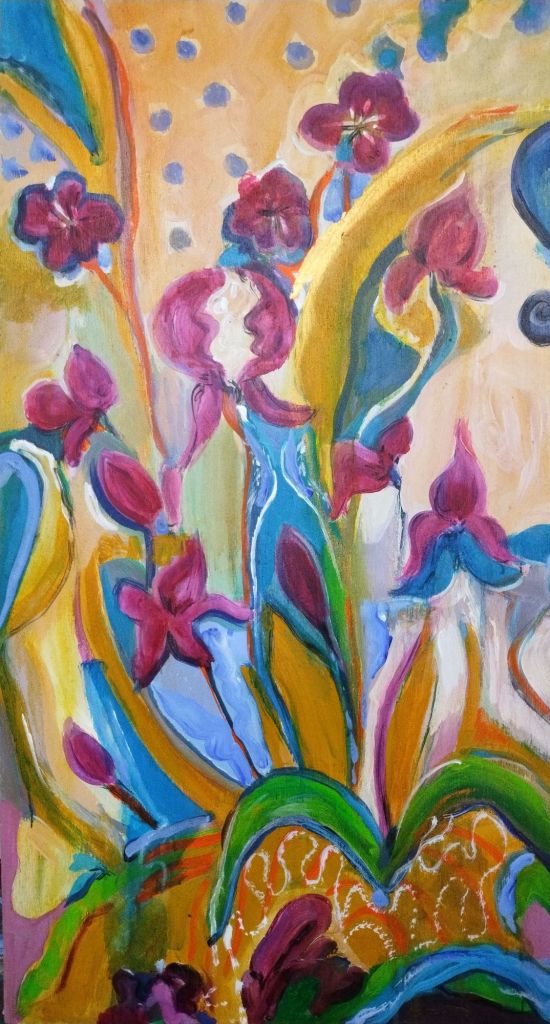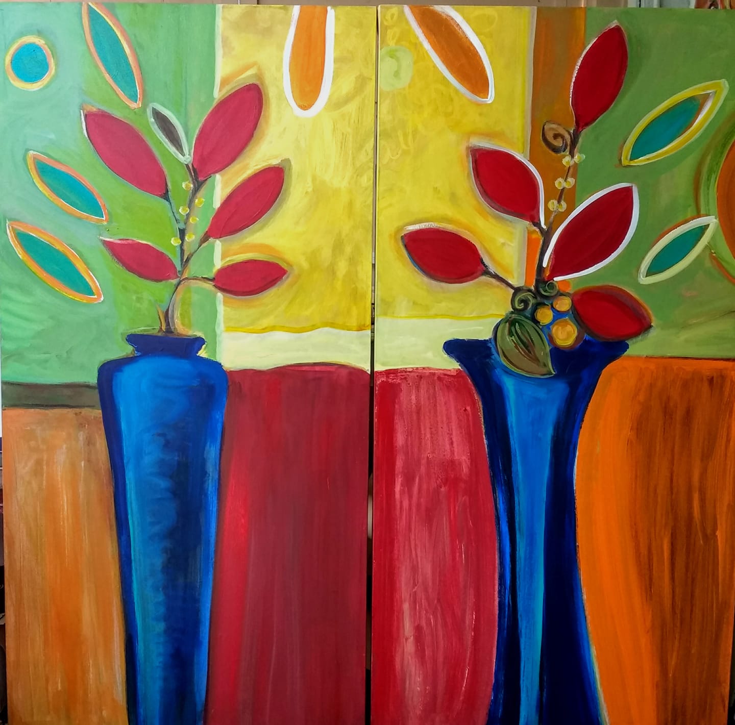 A duo of “April Flowers”, each are 4′ H x 2′ W, acrylic on canvas.