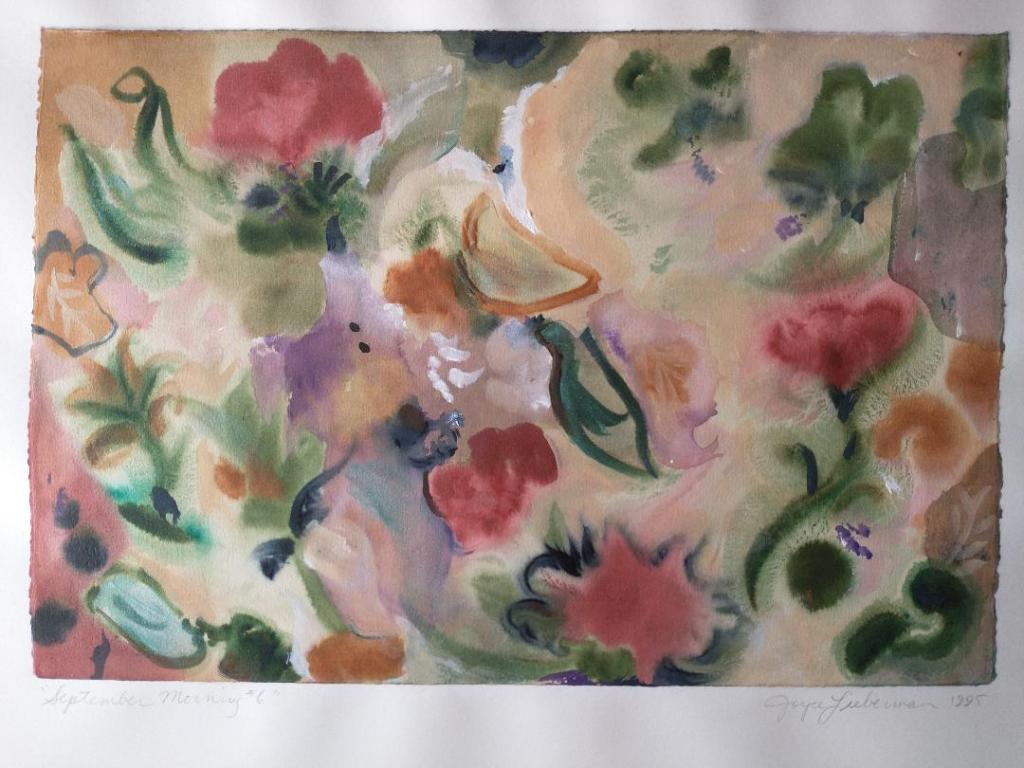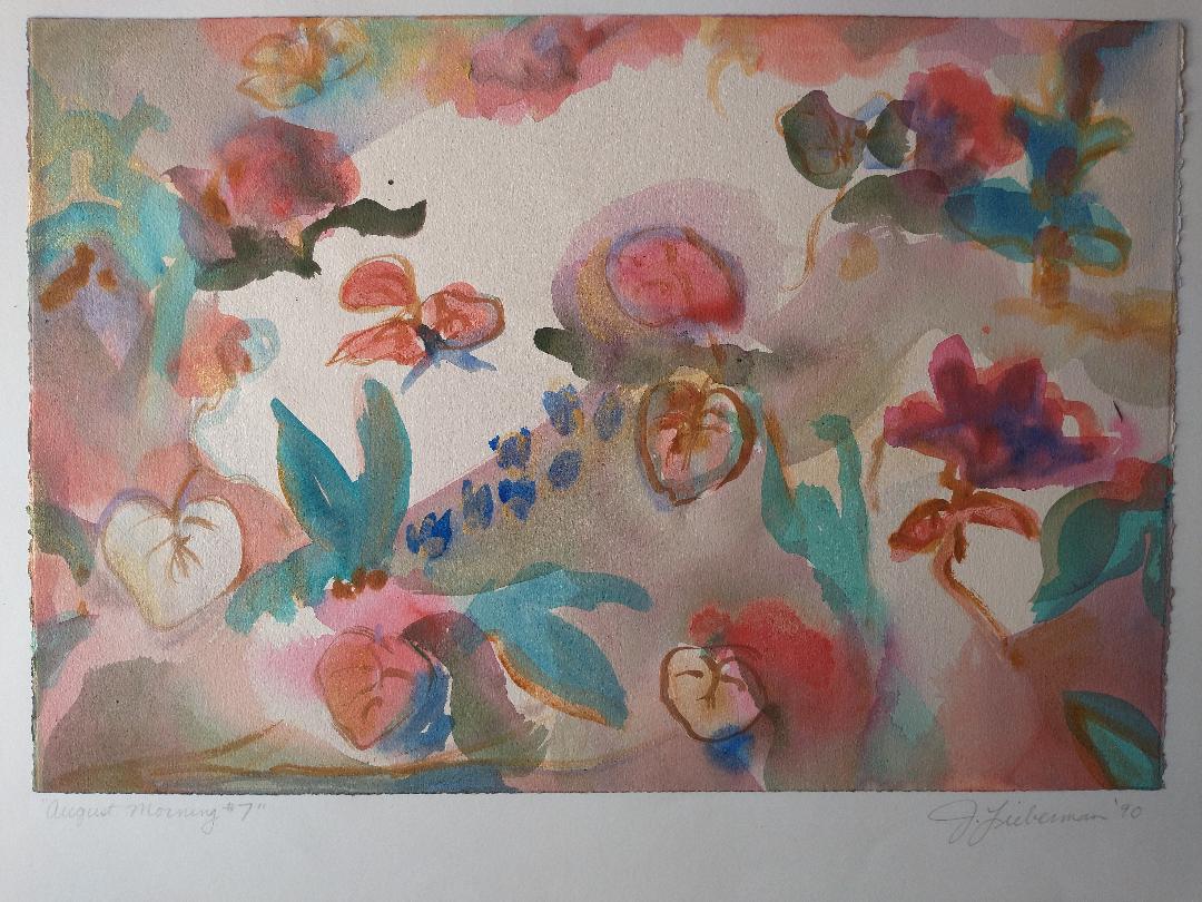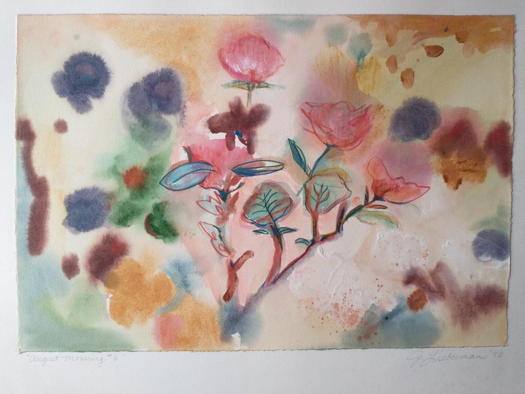 Soft Florals with a watercolor feel on paper from the “August Morning” series are 15″H x 22″W on arches paper mounted on 22 x30″ Stonehenge paper.